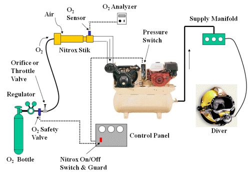 The schematic below illustrates how the Nitrox Safety Valve is incorporated into the Nitrox Stik Continuous Gas Blender technology to make Enriched Air for SCUBA with a High Pressure Air Compressor.