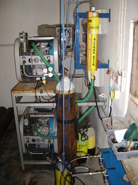 Nitrox Stik, Nitrox Safety Valve and oxygen supply located adjacent to compressor. Nitrox on/off switch and Maxtec oxygen analyzer located on wall.
